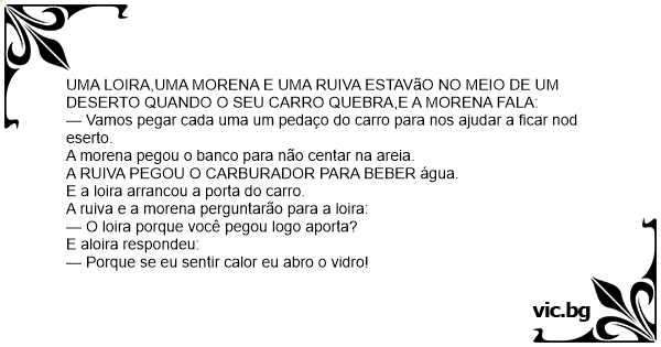 UMA LOIRA,UMA MORENA E UMA RUIVA ESTAVãO NO MEIO DE UM DESERTO QUANDO O SEU CARRO QUEBRA,E A MORENA FALA:
