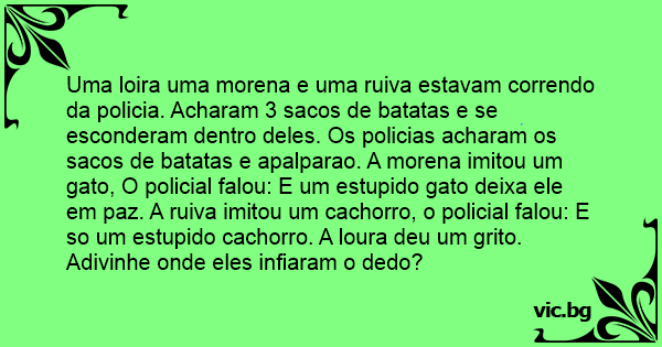 Uma loira uma morena e uma ruiva estavam correndo da policia. Acharam 3 sacos de batatas e se esconderam dentro deles. Os policias acharam os sacos de batatas e apalparao. A morena imitou um gato, O policial falou: E um estupido gato deixa ele em paz. A ruiva imitou um сасhоrrо, o policial falou: E so um estupido сасhоrrо. A loura deu um grito. Adivinhe onde eles infiaram o dedo?