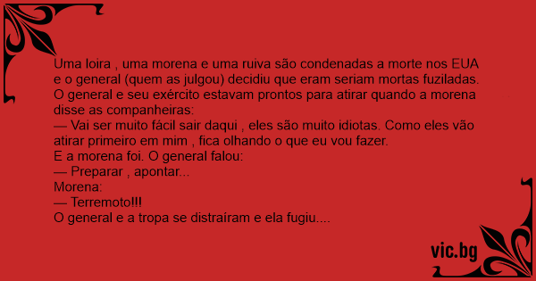 Uma loira , uma morena e uma ruiva são condenadas a morte nos EUA e o general (quem as julgou) decidiu que eram seriam mortas fuziladas.