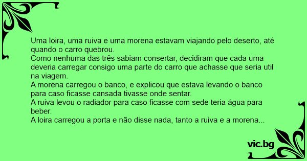 Uma loira, uma ruiva e uma morena estavam viajando pelo deserto, até quando o carro quebrou.