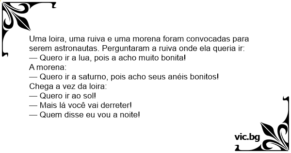 Uma loira, uma ruiva e uma morena foram convocadas para serem astronautas. Perguntaram a ruiva onde ela queria ir: