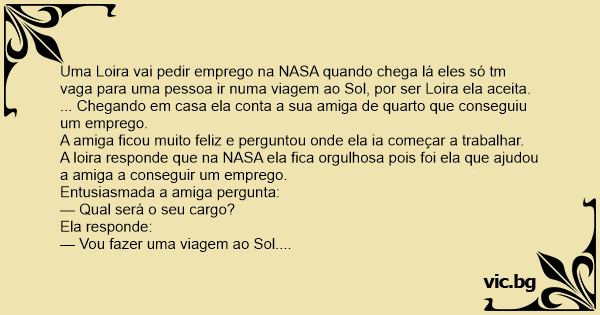 Uma Loira vai pedir emprego na NASA quando chega lá eles só tm vaga para uma pessoa ir numa viagem ao Sol, por ser Loira ela aceita.