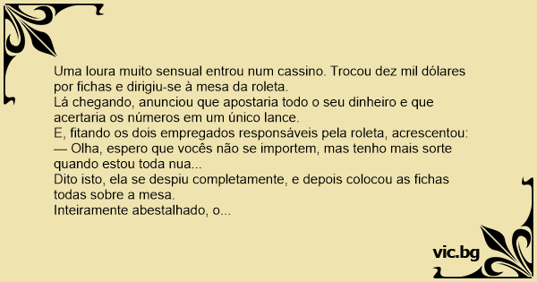 Uma loura muito sensual entrou num cassino. Trocou dez mil dólares por fichas e dirigiu-se à mesa da roleta.