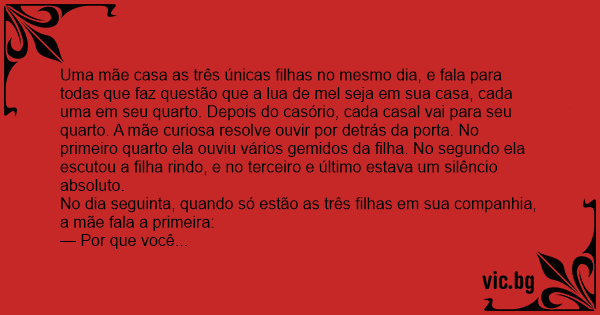 Uma mãe casa as três únicas filhas no mesmo dia, e fala para todas que faz questão que a lua de mel seja em sua casa, cada uma em seu quarto. Depois do casório, cada casal vai para seu quarto. A mãe curiosa resolve ouvir por detrás da porta. No primeiro quarto ela ouviu vários gemidos da filha. No segundo ela escutou a filha rindo, e no terceiro e último estava um silêncio absoluto.