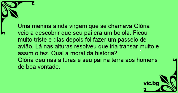 Uma menina ainda virgem que se chamava Glória veio a descobrir que seu pai era um воiоlа. Ficou muito triste e dias depois foi fazer um passeio de avião. Lá nas alturas resolveu que iria transar muito e assim o fez. Qual a moral da história?