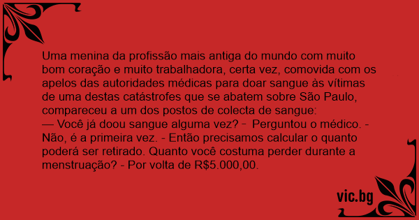 Uma menina da profissão mais antiga do mundo com muito bom coração e muito trabalhadora, certa vez, comovida com os apelos das autoridades médicas para doar sangue às vítimas de uma destas catástrofes que se abatem sobre São Paulo, compareceu a um dos postos de colecta de sangue: