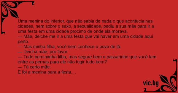— Tudo bem minha filha, mas segure bem o passarinho que você tem entre as pernas para ele não fugir tudo bem?