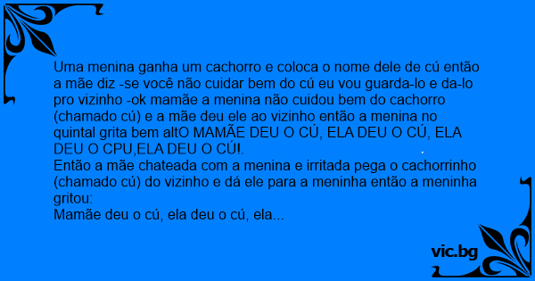 Uma menina ganha um сасhоrrо e coloca o nome dele de cú então a mãe diz -se você não cuidar bem do cú eu vou guarda-lo e da-lo pro vizinho -ok mamãe a menina não cuidou bem do сасhоrrо (chamado cú) e a mãe deu ele ao vizinho então a menina no quintal grita bem altO MAMÃE DEU O CÚ, ELA DEU O CÚ, ELA DEU O CPU,ELA DEU O CÚ!.