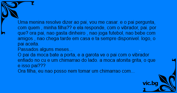 Uma menina resolve dizer ao pai, vou me casar. e o pai pergunta, com quem , minha filha?? e ela responde, com o vibrador, pai. por que? ora pai, nao gasta dinheiro , nao joga futebol, nao bebe com amigos , nao chega tarde em casa e ta sempre disponivel. logo, o pai aceita.