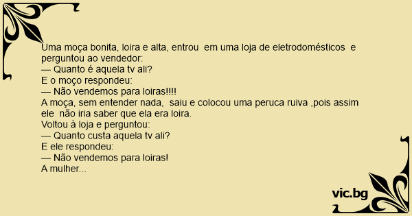 Um dia uma loira foi numa loja conprar uma televisao e pergunta para o comerciante: Quantovale essa tv???? O comerciante responde não vendemos!!! Ai a lora foi en casa e pintou o cabelo de ruivo...