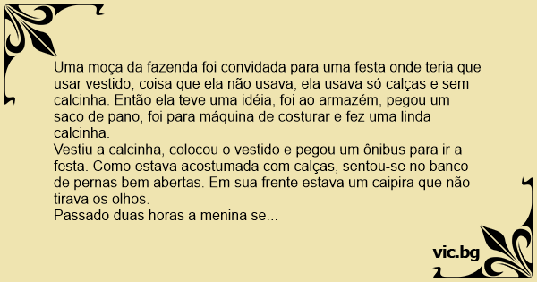 Vestiu a calcinha, colocou o vestido e pegou um ônibus para ir a festa. Como estava acostumada com calças, sentou-se no banco de pernas bem abertas. Em sua frente estava um caipira que não tirava os olhos.
