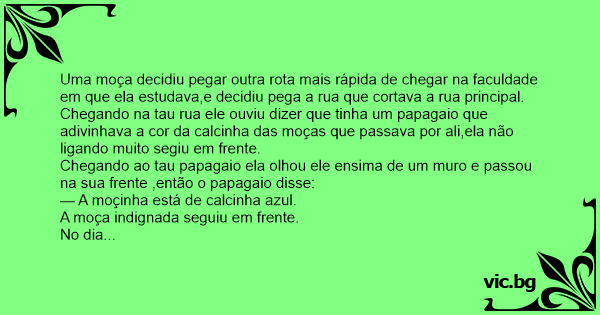 E quando ela ia dobrando a esquina o papagaio grita para todo mundo ouvir,o seguinte:
