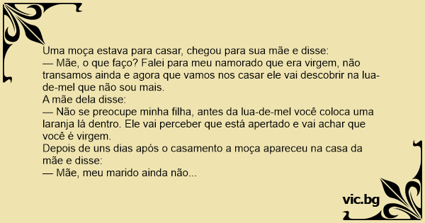 — Não se preocupe minha filha, antes da lua-de-mel você coloca uma laranja lá dentro. Ele vai perceber que está apertado e vai achar que você é virgem.