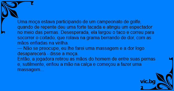 Uma loira estava jogando golf!Quando da uma tacada muito forte e acerta um rapaz que cai com as mãos entre as pernas. Com dó a loira diz ser uma enfermeira e sugere uma massagem. Que o rapaz...