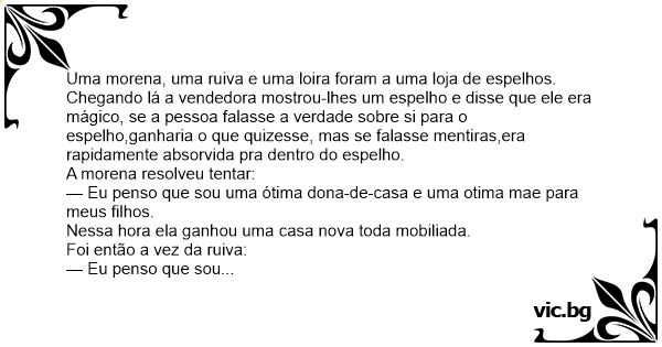 Uma morena, uma ruiva e uma loira foram a uma loja de espelhos. Chegando lá a vendedora mostrou-lhes um espelho e disse que ele era mágico, se a pessoa falasse a verdade sobre si para o espelho,ganharia o que quizesse, mas se falasse mentiras,era rapidamente absorvida pra dentro do espelho.