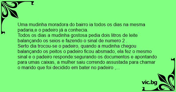 Serto dia trocou-se o padeiro, quando a mudinha chegou balançando os peitos o padeiro ficou absmado, ela fez o mesmo sinal e o padeiro responde:segurando os documentos e apontando para umas caixas, a mulher saiu correndo assustada para chamar o marido que foi decidido em bater no padeiro , chegando lá o marido da loira gostosa pergunta ,tá doido rapa fazer isso pra minha mulher?