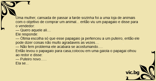 Uma mulher, cansada de passar a tarde sozinha foi a uma loja de animais com o objetivo de comprar um animal... então viu um papagaio e disse para o vendedor: