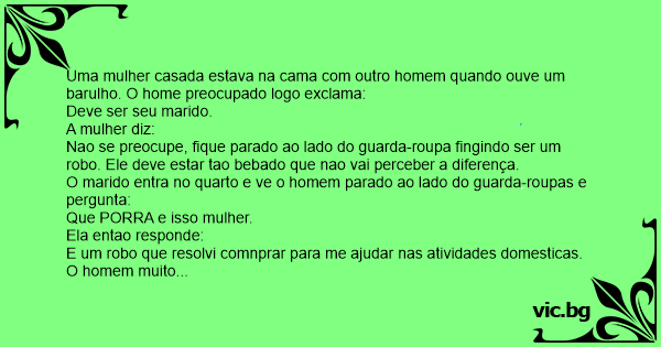 Uma mulher casada estava na cama com outro homem quando ouve um barulho. O home preocupado logo exclama:
