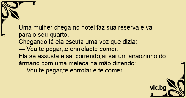 Uma mulher chega no hotel faz sua reserva e vai para o seu quarto. Chegando lá ela escuta uma voz que dizia: — Vou te pegar,te enrrolaete comer. Ela se assusta e sai correndo,aí sai um anãozinho do àrmario com uma meleca na mão dizendo: — Vou te pegar,te enrrolar e te comer.
