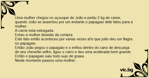 Uma mulher chegou no açouque de João e pediu 2 kg de carne, quando João se ausentou por um instante o papagaio dele falou para a mulher: