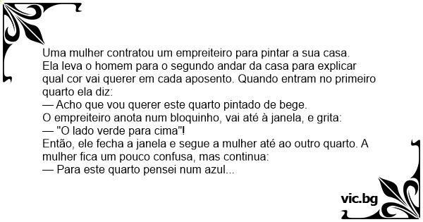 A mulher fiса desconcertada, mas não comenta nada. O quarto seguinte, ela diz que quer pintado de rosa. E uma vez mais o empreiteiro anota, abre a janela e grita: