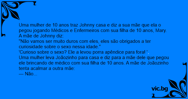 Uma mulher leva Joãozinho para casa e diz para a mãe dele que pegou ele brincando de médico com sua filha de 10 anos. A mãe de Joãozinho tenta acalmar a outra mãe: