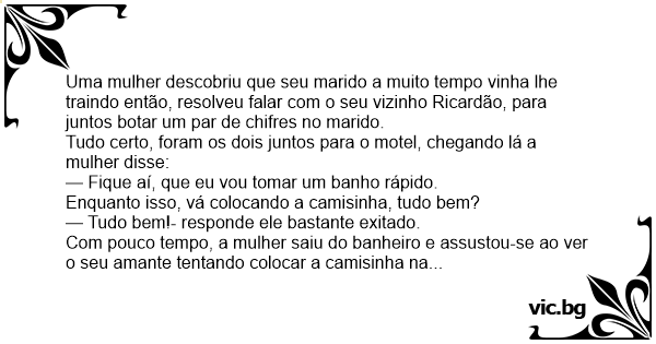 Uma mulher descobriu que seu marido a muito tempo vinha lhe traindo então, resolveu falar com o seu vizinho Ricardão, para juntos botar um par de chifres no marido.