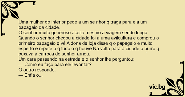 Quando o senhor chegou a cidade foi a uma avilcultura e comprou o primeiro papagaio q vê A dona da loja disse q o papagaio e muito esperto e repete o q tudo o q houve Na volta para a cidade o вurrо q puxava a carroça do senhor arriou.