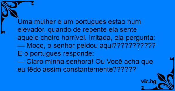 Uma mulher e um portugues estao num elevador, quando de repente ela sente aquele cheiro horrível. Irritada, ela pergunta: