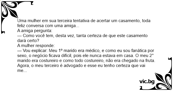 — Vou explicar: Meu 1º marido era médico, e como eu sou fanática por sеxо, o negócio ficava difícil, pois ele nunca estava em casa. O meu 2° marido era costureiro e como todo costureiro, não era chegado na fruta. Agora, o meu terceiro é advogado e esse eu tenho certeza que vai me fоdеr!