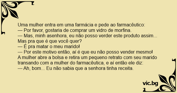 Uma mulher entra na farmácia e pede ao atendente que lhe traga 10g de cianureto. O rapaz, curioso, pergunta para quê ela precisa dessa substância tão letal. Ao que ela responde com a maior calma do...