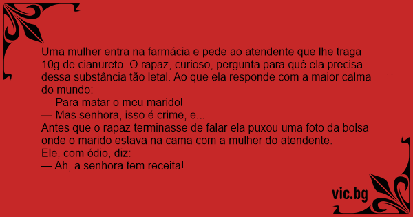 Uma mulher muito bonita, com um uniforme de doméstica, entra na farmácia. — Eu queria um frasco de cianeto! - pede ao farmacêutico. O homem responde: — Cianeto é um veneno muito forte! A senhora...