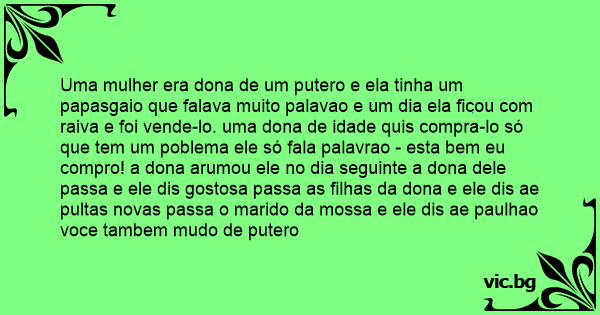 Uma mulher era dona de um putero e ela tinha um papasgaio que falava muito palavao e um dia ela ficou com raiva e foi vende-lo. uma dona de idade quis compra-lo só que tem um poblema ele só fala palavrao - esta bem eu compro! a dona arumou ele no dia seguinte a dona dele passa e ele dis gostosa passa as filhas da dona e ele dis ae pultas novas passa o marido da mossa e ele dis ae paulhao voce tambem mudo de putero