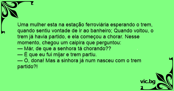 Uma mulher esta na estação ferroviária esperando o trem, quando sentiu vontade de ir ao banheiro; Quando voltou, o trem já havia partido, e ela começou a chorar. Nesse momento, chegou um caipira que perguntou: