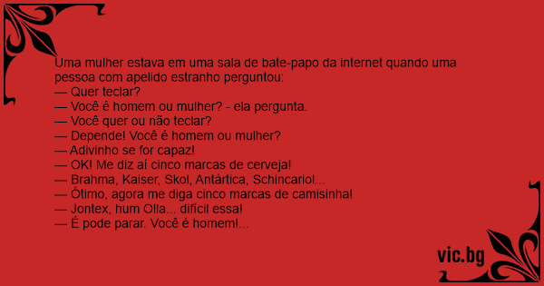 Uma mulher estava em uma sala de bate-papo da internet quando uma pessoa com apelido estranho perguntou: