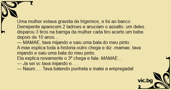 Uma mulher estava gravida de trigemios, e foi ao banco. Derrepente aparecem 2 ladroes e anuciam o assalto. um deles disparou 3 tiros na barriga da mulher cada tiro acerto um bebe. depois de 10 anos....