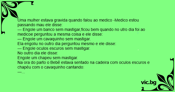 — Engole um banco sem mastigar,ficou bem quando no utro dia foi ao medicoe perguntou a mesma coisa e ele disse: