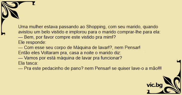 Uma mulher estava passando ao Shopping, com seu marido, quando avistou um belo vistido e implorou para o marido comprar-lhe para ela: