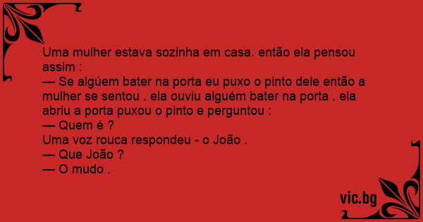 — Se algúem bater na porta eu puxo o pinto dele então a mulher se sentou . ela ouviu alguém bater na porta . ela abriu a porta puxou o pinto e perguntou :