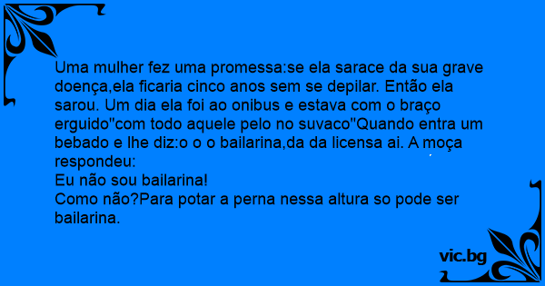 Uma mulher fez uma promessa:se ela sarace da sua grave doença,ela ficaria cinco anos sem se depilar. Então ela sarou. Um dia ela foi ao onibus e estava com o braço erguido"com todo aquele pelo no suvaco"Quando entra um bebado e lhe diz:o o o bailarina,da da licensa ai. A moça respondeu: