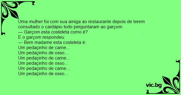 Uma mulher foi com sua amiga ao restaurante depois de terem consultado o cardápio todo perguntaram ao garçom: