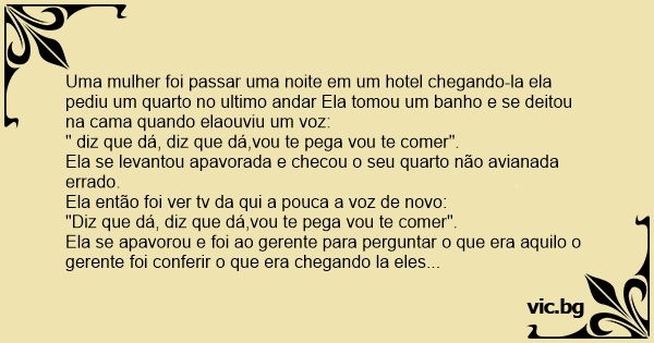 Uma mulher foi passar uma noite em um hotel chegando-la ela pediu um quarto no ultimo andar Ela tomou um banho e se deitou na cama quando elaouviu um voz: