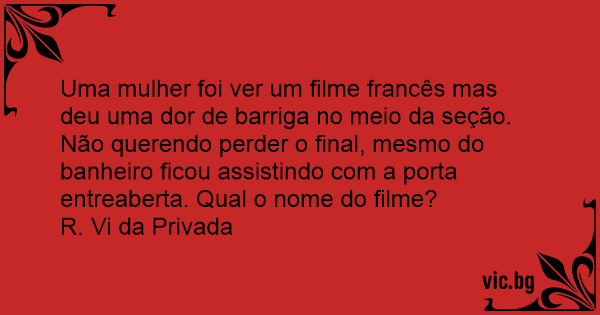 Uma mulher foi ver um filme francês mas deu uma dor de barriga no meio da seção. Não querendo perder o final, mesmo do banheiro ficou assistindo com a porta entreaberta. Qual o nome do filme?