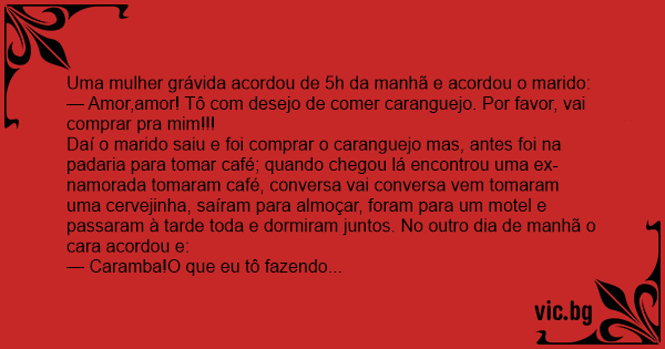 Daí o marido saiu e foi comprar o caranguejo mas, antes foi na padaria para tomar café; quando chegou lá encontrou uma ex-namorada tomaram café, conversa vai conversa vem tomaram uma cervejinha, saíram para almoçar, foram para um motel e passaram à tarde toda e dormiram juntos. No outro dia de manhã o cara acordou e: