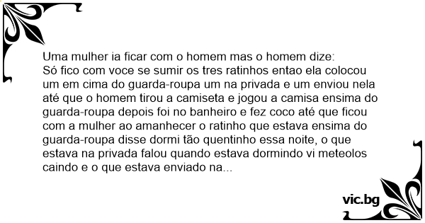 Só fico com voce se sumir os tres ratinhos entao ela colocou um em cima do guarda-roupa um na privada e um enviou nela até que o homem tirou a camiseta e jogou a camisa ensima do guarda-roupa depois foi no banheiro e fez coco até que ficou com a mulher ao amanhecer o ratinho que estava ensima do guarda-roupa disse dormi tão quentinho essa noite, o que estava na privada falou quando estava dormindo vi meteolos caindo e o que estava enviado na mulher disse quando estava passeando pela floresta encantada vi uma cobra gigante que soltava uma baba verde.