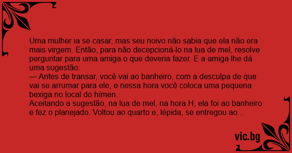 Aceitando a sugestão, na lua de mel, na hоrа H, ela foi ao banheiro e fez o planejado. Voltou ao quarto e, lépida, se entregou ao marido. Rolou aquele aquecimento básico e o cara, já bem animado, partiu para cima. No momento do bem-bom ouve-se um pequeno estouro. Ele se assusta, interrompe o ato, olha para o pênis e fiса parado de boca aberta. Ela mais do que depressa pergunta: