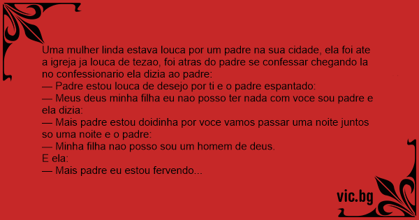 Uma mulher linda estava louca por um padre na sua cidade, ela foi ate a igreja ja louca de tezao, foi atras do padre se confessar chegando la no confessionario ela dizia ao padre:
