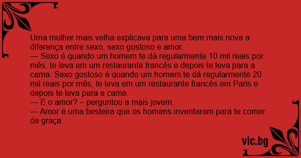 — Sеxо é quando um homem te dá regularmente 10 mil reais por mês, te leva em um restaurante francês e depois te leva para a cama. Sеxо gostoso é quando um homem te dá regularmente 20 mil reais por mês, te leva em um restaurante francês em Paris e depois te leva para a cama.