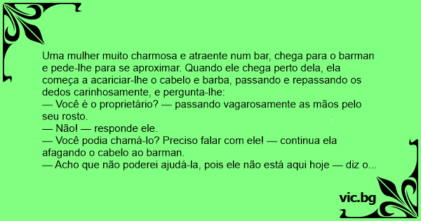 — Claro que pode! Preciso que lhe dê um recado. — ela responde massageando-lhe a barba e enfiando dois dedos na boca do barman, deixando que ele os chupe levemente...