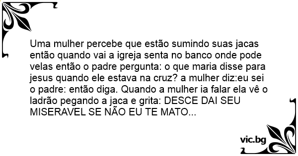 Uma mulher percebe que estão sumindo suas jacas então quando vai a igreja senta no banco onde pode velas então o padre pergunta: o que maria disse para jesus quando ele estava na cruz? a mulher diz:eu sei o padre: então diga. Quando a mulher ia falar ela vê o ladrão pegando a jaca e grita: DESCE DAI SEU MISERAVEL SE NÃO EU TE MATO...